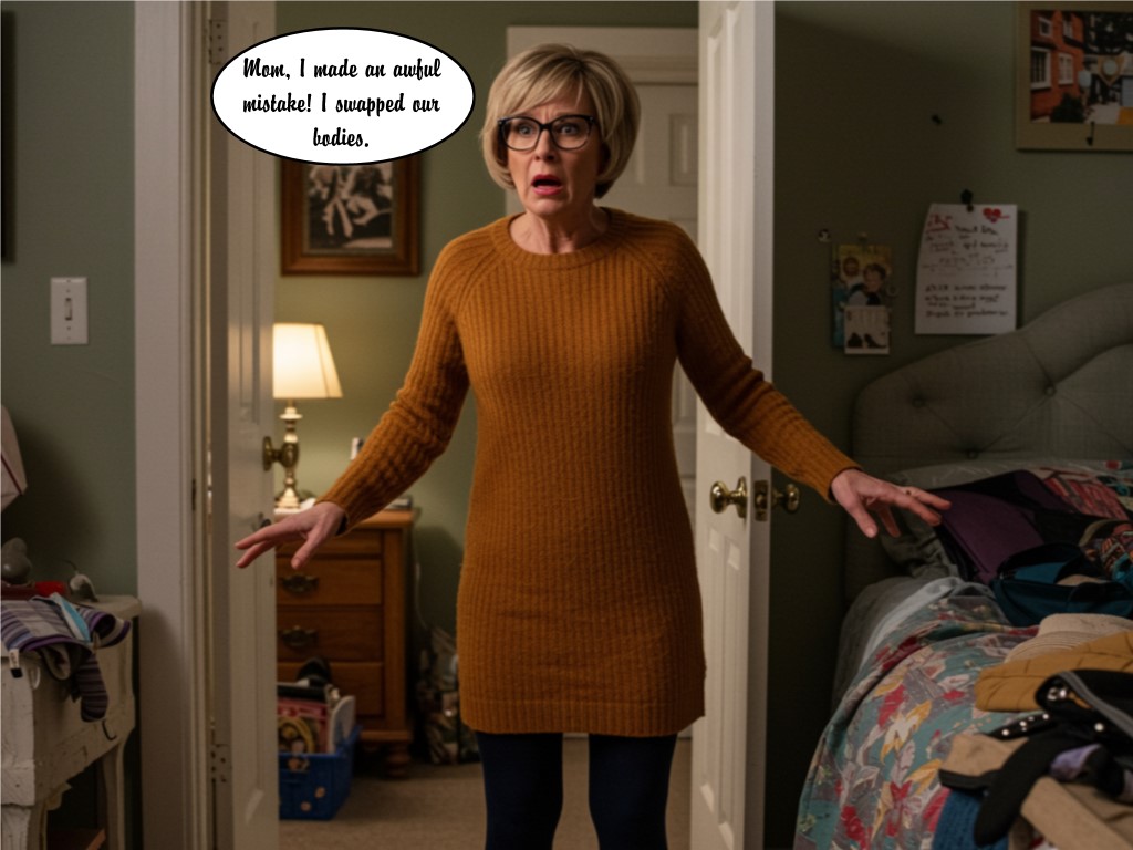 Gerald had always thought it was convenient living in the same building as his mother-different apartments, same hallway, easy visits, no commute for holidays. But convenience had turned into catastrophe the instant he’d tried that stupid spell. One moment he’d been standing in his own apartment, in his own tall, broad-shouldered body, clutching the cracked leather spellbook he’d found at a thrift shop. The next- A lurch. A dizzying squeeze, like being pushed through a keyhole. A gasp that wasn’t his voice. And suddenly he was not in his apartment anymore. He staggered back, blinking at the floral-print couch, the framed cross-stitch, the pale pink curtains. This was his mother’s apartment. And when he looked down- A small, delicate hand with neatly painted nails. A body swallowed in a mustard-colored long-sleeved sweater dress, the knit fabric hugging curves he’d never possessed until five seconds ago. Black leggings stretched against his legs. And on his feet-mustard pumps with a modest heel. “What-oh no. Oh no no no no-” His voice was soft, feminine, breathy-his mother’s voice. Panic surged like electricity. He didn’t think. He just moved. He ran for the door, the click-clack of his heels echoing down the stairwell, each step sending an unfamiliar bounce through his chest that made him flinch in shock. His heart hammered as he burst into the hallway and fumbled with the key to his apartment-well, his former apartment. “Mom! Mom, what happened, are you-” He threw the door open. Empty. No sign of his mother. No sign of his body. And worst of all- The spellbook was gone. Gerald felt his breath stutter. “She must’ve taken it-she must’ve-why would she-” He spun and bolted back up the stairs, nearly tripping in the pumps, the sway of his hips making his balance unfamiliar and precarious. Maybe he had passed her. Maybe she’d returned to her own apartment. Maybe- But her home was empty too. He barely slept that night. Every time he shifted, stray bits of hair brushed against his cheeks, the weight of his mother’s smaller frame making him feel like a guest inside himself. He tried not to think about the way the dress clung when he moved, or about how foreign his voice sounded when he whimpered into the pillow. It wasn’t until the next morning-sunlight already warming the blinds-that the front door finally opened. Gerald jumped to his feet. Standing there, smiling casually, was his mother wearing his body-his tall frame, his stubble, his T-shirt. And beside her, holding his former hand, was Wendy, his girlfriend. Wendy looked...not shocked. Not confused. But understanding. “Morning, sweetie,” his mother said-with his voice. Gerald’s stomach twisted. “We-Mom, we need to talk. Privately.” “Oh, don’t worry,” she said breezily, setting the spellbook on the counter. “Wendy knows everything. There’s nothing to hide.” Gerald felt heat rising in the cheeks he now wore. “We are swapping back. Now.” He lunged for the spellbook-only to be blocked by his own body. His mother’s-no, his-bigger hands easily held him at bay. In her control, his height and arm-span felt insurmountable. His new, petite muscles trembled uselessly. “Gerald,” she said gently, “you can’t overpower me like this. I get it, you’re scared. But I don’t want to switch back yet.” “What do you mean, you don’t-what-Mom, this isn’t funny!” “I’m not trying to be funny. I can help you. Make this easier.” Her hands opened the spellbook with practiced ease. “You shouldn’t have tried spells you didn’t understand.” Before he could shout another protest, she whispered an incantation-smoothly, confidently. Symbols flared across the pages, swirling upward in threads of gold. They wrapped around him. Gerald gasped as a rush of information rammed into his mind-not memories, but knowledge. How to care for thinning middle-aged skin. Which moisturizers prevented creasing around the eyes. How to coordinate outfits for his mother’s color palette-how mustard was her signature shade because of her undertones. How to match a lip tint to a sweater dress.