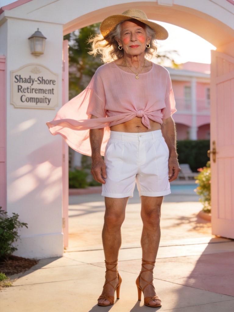 When Roger Whitmore signed himself out of Shady-Shore Retirement Community that morning, the receptionist barely looked up. “Heading out with your granddaughter again, Mr. Whitmore?” she asked pleasantly. “Yes, indeed,” Roger said, smiling as Dawn stood beside him-eighteen, sun-kissed, and home from her first year of college. “We’ll be back before dinner.” Dawn grinned. “Promise. I’ll bring him back in one piece.” No one thought twice about it. Dawn visited often. She took him to the boardwalk, to little cafés, to the park where he liked to feed the ducks. It was one of the bright spots of the week at Shady-Shore, watching the old man shuffle out proudly beside such a lively young woman. But when the front doors slid open again in the early evening, the receptionist did look up. And then she blinked. Walking through the doorway-alone-was an elderly man. Eighty-one years old. Thin but upright. Familiar face. But everything else about him was wrong. He was dressed in a breezy pastel pink cotton crop top tied at the waist. High-waisted white nylon cut-off shorts revealed pale, spotted knees. Tan strappy heels wobbled uncertainly beneath him. A thin gold necklace rested against his collarbone. Small hoop earrings glinted from newly pierced-or perhaps cleverly clipped-ears. His lips shone with a soft gloss. A touch of peach blush warmed his cheeks. Loose, beachy waves-far fuller and more artfully styled than Roger’s usual wispy hair-framed his face under a casually angled straw sunhat. He stepped inside carefully, adjusting the hat. The lobby fell silent. “Mr. Whitmore?” the receptionist ventured. The old man frowned-no, not frowned. Pouted. “My name is Dawn,” he said firmly. His voice was Roger’s-raspy and aged-but softened, as if trying to glide into something lighter. “I’m looking for my grandfather. I seem to have misplaced him.” There was a long pause. Shady-Shore had seen things before. Mrs. Delaney once insisted she was a circus acrobat awaiting her trapeze cue. Mr. Jamison frequently claimed to be hosting a talk show in the rec room. Outlandish declarations were, sadly, part of the landscape. The receptionist exchanged a subtle glance with the activities director. “Of course you are, dear,” she said gently. “Why don’t you come sit down? I’m sure your grandfather will turn up.” “I’d prefer to wait somewhere comfortable,” he-she-said, adjusting the strap of one heel. “And I’m starving. I haven’t eaten since lunch.” “Well,” the director said kindly, “you’re welcome to have dinner here while you wait.” Dawn hesitated, then nodded. “That would be lovely.” Word spread quickly through the dining hall. Roger Whitmore was back. But Roger Whitmore insisted he was Dawn. He moved differently-shoulders pulled back, steps careful but deliberate. He crossed his legs at the knee when he sat. He tucked loose strands of hair behind his ear. He checked his reflection in the silverware. When Mr. Alvarez at the next table squinted at him and said, “Roger, what on earth are you wearing?” the old man stiffened. “My name is Dawn,” he corrected coolly. “And this is simply what I had on when my grandfather vanished.” “Vanished where?” Mrs. Delaney asked, delighted by the drama. “I turned around at the boardwalk and he was gone,” Dawn said. “One minute he was complaining about seagulls. The next-poof.” He snapped his fingers, glossy lips pursed. “I assume he wandered off.” The staff let it pass. Contradicting him would only agitate him. Better to play along, keep him calm, observe. “So you’ll wait here?” the receptionist asked later. “Yes,” Dawn said firmly. “I’m not leaving without him.” Hours passed. He never once referred to himself as Roger. When addressed as Mr. Whitmore, he politely corrected them. When someone asked if he needed help changing back into his “comfortable clothes,” he frowned. “These are my comfortable clothes.” He ate lightly-salad, grilled chicken, sparkling water with lemon. He complimented the chef. He asked for a napkin to dab his lip gloss. But beneath the performance-if it was a performance-there were cracks. Once, when he thought no one was watching, he flexed his arthritic fingers and stared at them in confusion, as though they didn’t belong to him. Another time, he caught sight of his reflection in the darkened window and froze. His eyes widened-not in vanity, but in shock. He reached up, touching his cheek as if expecting smooth youth beneath his fingertips. Instead, he felt paper-thin skin. For a fleeting moment, something like fear crossed his face. Then it smoothed away. “I hope Grandpa isn’t cold,” he murmured softly to himself.