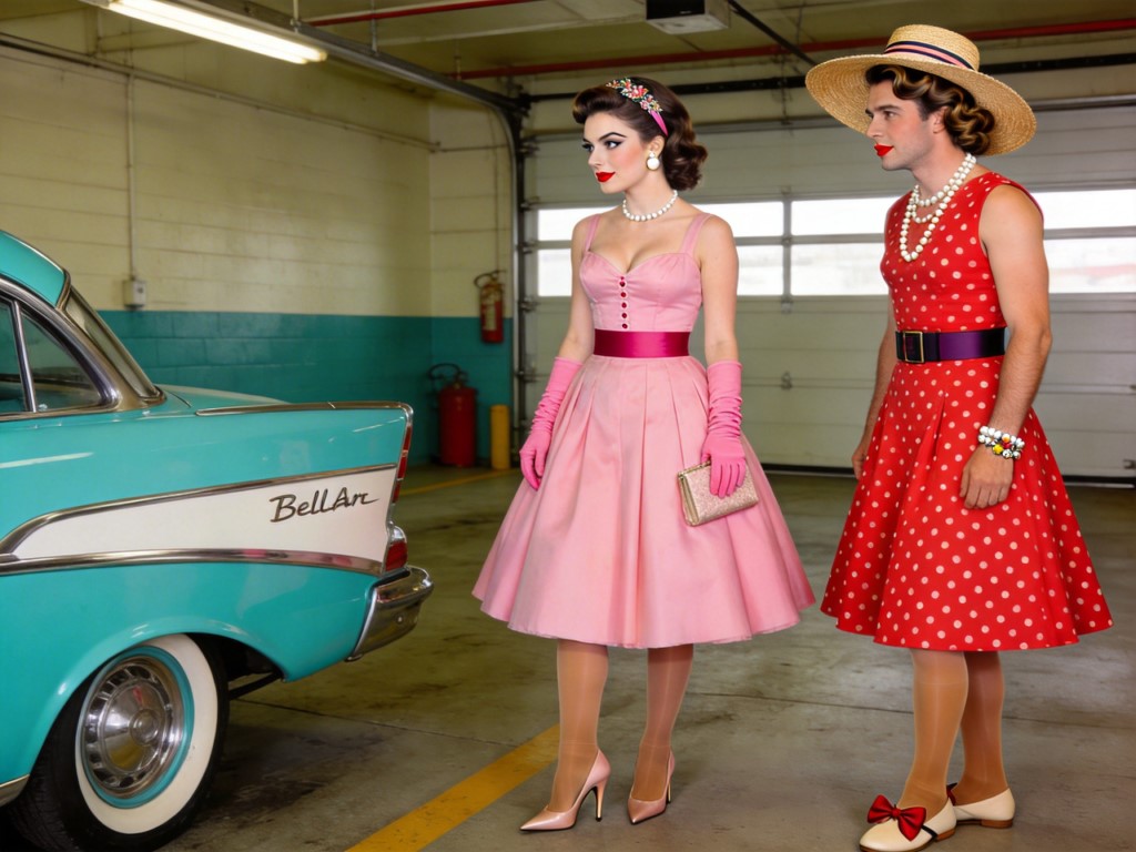 Jerry and Sol had been laughing when they set the dials. The machine hummed, the lights flickered-and then everything changed. They had intended to visit the 1950s briefly, observe the culture, and return home before dinner. But the moment the time machine completed its jump, it did something neither of them expected. It adapted. The sleek metallic chamber around them shuddered and folded inward like living metal. Panels reshaped themselves. Chrome appeared where smooth steel had been. Glass expanded into curved windows. By the time the shaking stopped, the time machine had transformed into a gleaming cyan 1957 Chevrolet Bel Air parked neatly inside a tidy suburban garage. Jerry and Sol staggered as the floor beneath them shifted. Then they realized something else had changed. Jerry looked down first. “Sol...,” he said slowly. He was wearing a powder-pink 1950s housewife dress. The dress was unmistakably classic. A fitted bodice hugged his torso with a sweetheart neckline, tiny delicate buttons running down the center. The waist was cinched tightly with a wide contrasting sash that emphasized the fashionable hourglass silhouette. Below it spread a full skirt, supported by layers of crinolines that puffed it outward until it fell just below the knees. Jerry lifted the hem slightly and saw suntan pantyhose stretched smoothly over his legs, ending in a pair of neat kitten-heeled pumps. On his hands were matching gloves. A small clutch purse dangled from his wrist. He reached up slowly to touch his face. “Sol... I’m wearing makeup.” A small mirror hung on the garage wall. Jerry hurried over and stared. His face still looked mostly like his own-but now it was softened by carefully applied cosmetics. Bold red lipstick, precise winged eyeliner, perfectly arched brows. His hair had grown longer and was arranged in glossy waves held by a decorative hairband. Pearl earrings swung slightly as he turned his head. A simple pearl necklace rested on his collarbone. Behind him, Sol let out a groan. Jerry turned. Sol was leaning against the side of the Bel Air, staring down at himself. His outfit was different but equally unmistakable. Sol wore a vibrant red dress covered in white polka dots. It had a sleeveless fitted bodice and a flared knee-length skirt that moved lightly when he shifted his weight. A wide belt emphasized his waist. Suntan pantyhose covered his legs, leading down to flat shoes with little bows on the toes. A charm bracelet jingled softly on his wrist, and a wide-brimmed straw hat with a ribbon perched atop softly waved curls. His makeup was just as glamorous as Jerry’s-bright lipstick, mascara, and gentle eyeshadow. Sol slowly lifted his hands. “Jerry,” he said. “Tell me we’re in a nightmare.” Jerry pointed at the car. “That’s our time machine.” Sol stared at the Bel Air. “Oh,” he said faintly. “That’s bad.” They both rushed to the garage workbench where the machine’s control panel should have been. But the controls were gone. The dashboard of the Bel Air contained only ordinary 1950s gauges.