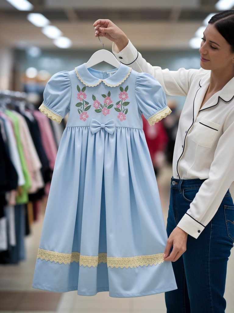 The man was short-painfully so, at least in his own estimation-and department stores never let him forget it. He stood beneath the harsh lights of the men’s suit section, jacket after jacket draped over his arm, each one swallowing him whole. Sleeves dangled past his fingertips, shoulders drooped, colors blurred into a parade of gray, navy, and tired charcoal. “No,” he said again, handing another suit back. The saleslady forced a smile. She had been with him nearly forty minutes. “I don’t like it,” he continued. “It’s bland. Dull. It looks like something meant for someone who wants to disappear.” She exhaled slowly through her nose. Commission sales meant patience, but patience had limits. He was clearly difficult to fit, impossible to please, and steadily draining her time. At last, she straightened. “You know,” she said carefully, “we *do* have a department that might be perfect for you.” He crossed his arms. “It’s about time.” She didn’t argue. She simply gestured and began walking. They passed belts. Shoes. Casualwear. Then, without ceremony, they entered the **girls’ and juniors’ department**-brightly lit, colorful, full of shorter proportions and expressive designs. The man stopped short. “What is this?” he demanded. She reached for a dress on a nearby rack: light blue, soft fabric, elastic waist, pale yellow trim. Small embroidered flowers dotted the bodice, and a neat Peter Pan collar framed the neckline.