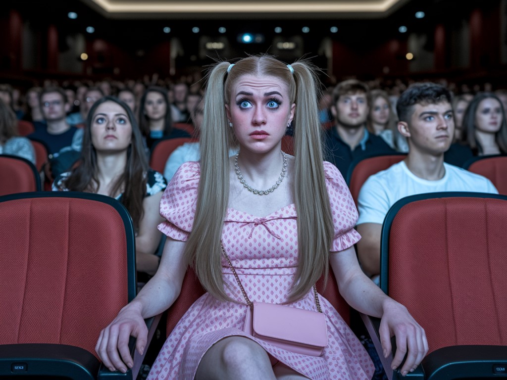 Kyle slipped into the semi-crowded theater just as the previews ended, the warm glow of the screen washing over rows of unsuspecting faces. He found an open seat in the middle of a long row-safe, anonymous, dark. People around him were settled in, whispering, snacking, laughing softly. Perfect cover. The comedy began, bright and ridiculous on the enormous screen. The audience chuckled, and Kyle tried to lose himself in the noise. But somewhere behind him, in the shifting blackness above the seats, something else was watching. He didn’t notice the first change. A faint tug at his scalp-nothing more than the feeling of static… until his brown hair slowly drained to honey blond in the dark, unnoticed even by him. Then it parted neatly into two straight, girlish pigtails that draped over his ears and began to lengthen inch by inch. He didn’t see the makeup either. Powder smoothing over his cheeks, color tinting his lids, mascara clasping each lash with meticulous, unseen fingers. His lips grew glossy, sweet, faintly waxy. The taste of lipstick touched his tongue. He ignored it. Maybe he thought it was residue from a soda he hadn’t even bought. His body shifted next-hair silently vanishing from his legs, arms, chest, every trace of it dissolving into the dark. His skin became smooth, soft, unfamiliar. But the theater air was cool, the movie loud; he chalked up any odd sensation to imagination. Only when his hair reached his shoulders-so long that it brushed them like someone behind him was playing with it-did a flicker of worry tickle the back of his mind. *That’s... not right.*